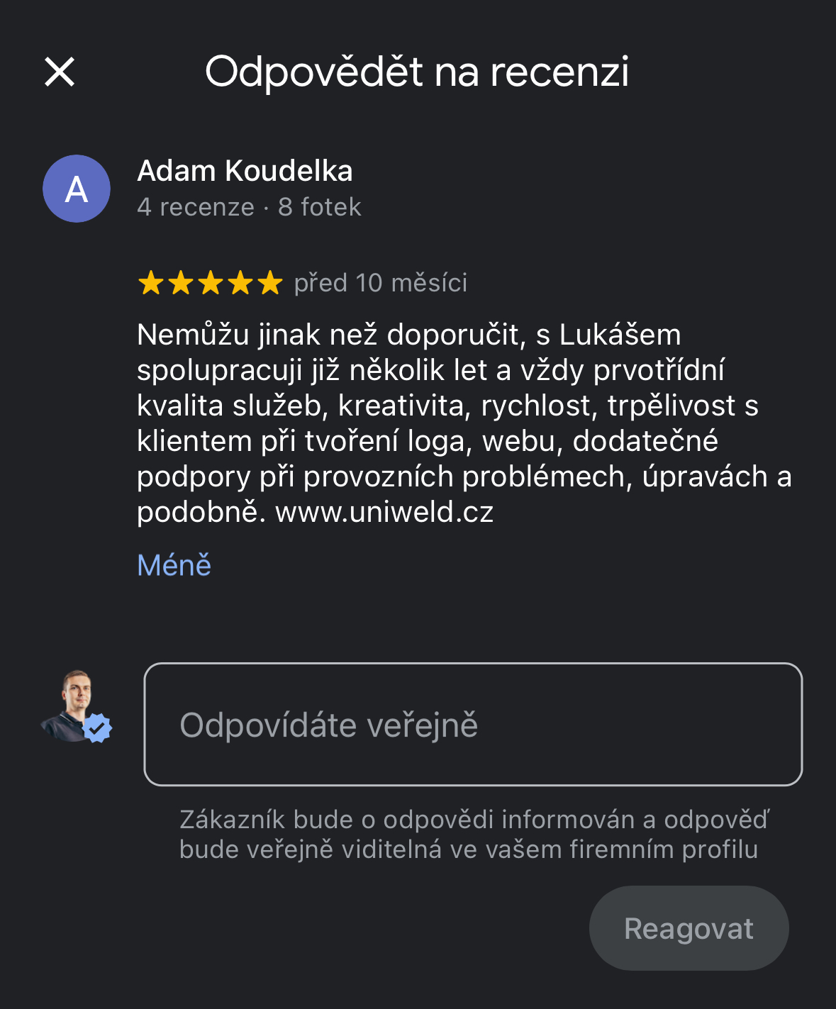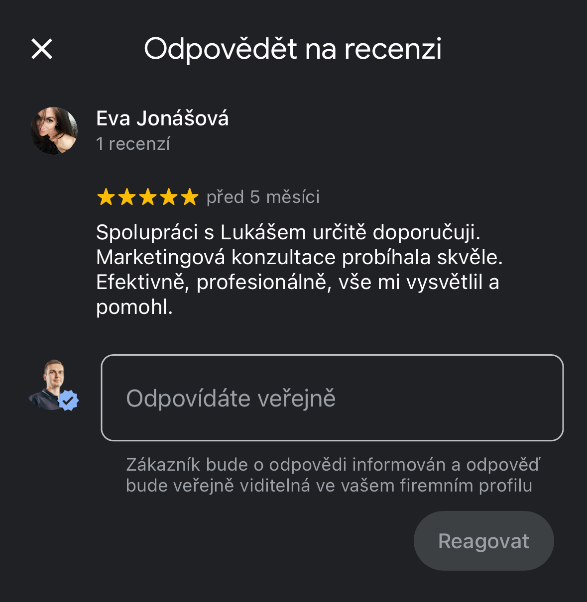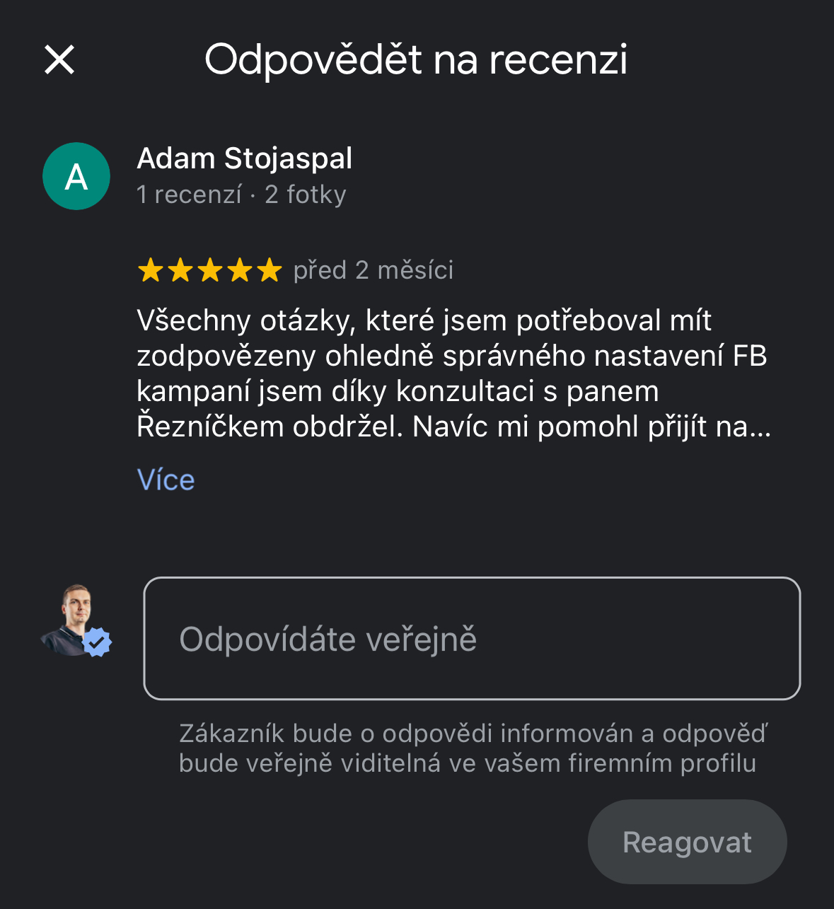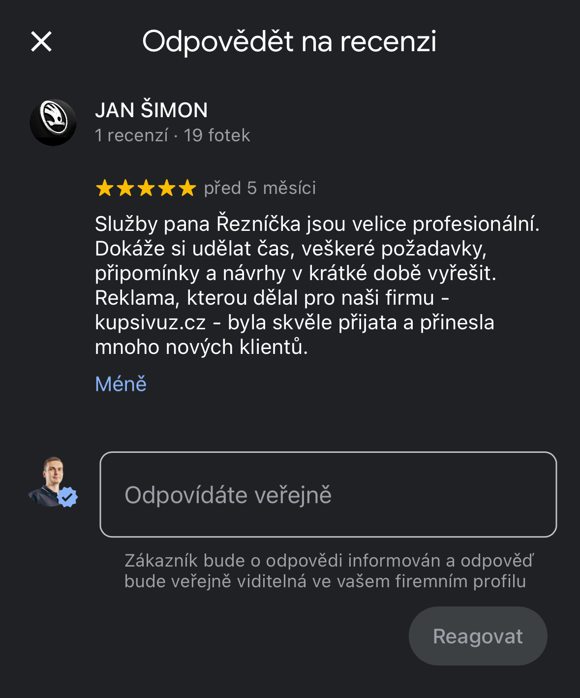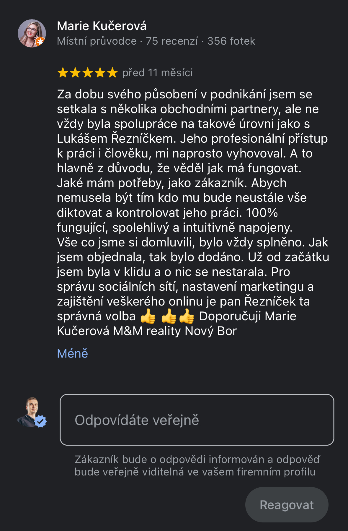 Objevil jsem reklamu pana Řezníčka, kterého jsem následně oslovil. Jelikož se mi od začátku líbil jeho vstřícný přístup a profesionalita, tak jsem se rozhodl využít jeho služeb. Zpětně tento krok hodnotím jednoznačně pozitivně. Kdykoliv jsem se totiž na něho obrátil, tak mi dokázal pomoci či vhodně poradit. Pana Řezníčka považuji za odborníka ve svém oboru.